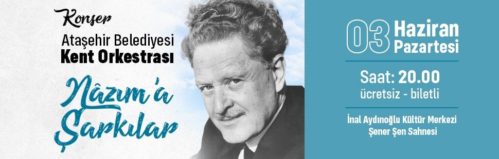 “Nazım’a Şarkılar” adlı konser, 3 Haziran Pazartesi günü saat 20.00'de başlayacak ve biletli/ücretsiz olarak vatandaşlara sunulacak. Nazım Hikmet sevenleri, konsere katılmak için biletlerini, İnal Aydınoğlu Kültür Merkezi gişesi ya da https://kultursanat.atasehir.bel.tr sayfamız üzerinden temin edebilirler. Online bilet sistemi 31 Mayıs Cuma günü, saat 12:00’de aktif olacak.