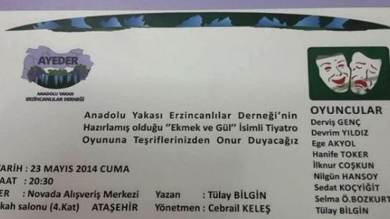 AYEDER, Anadolu Yakası Erzincanlılar Derneği NOVADA Alışveriş Merkezi Nikah Salonunda ''EKMEK ve GÜL'' adlı tiyatro oyunuyla Erzincanlılarla bir araya geliyor.