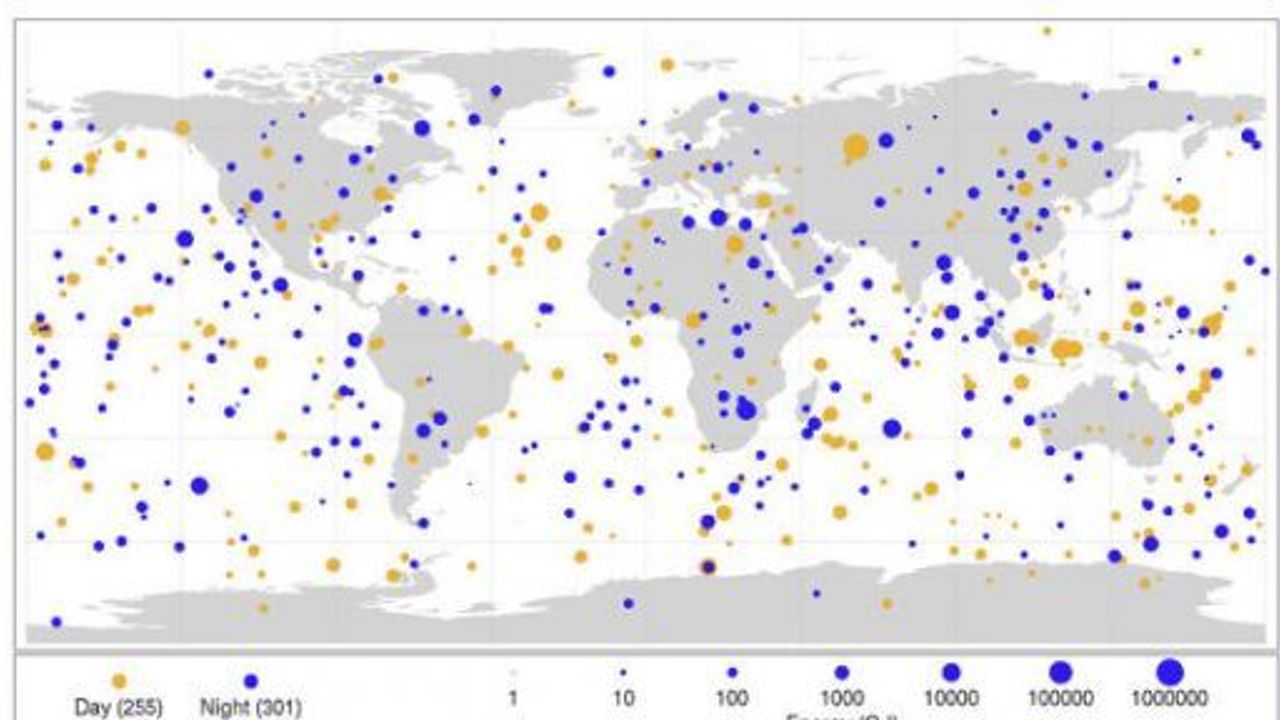 Haritadaki turuncu noktalar gündüz saatlerinde, mavi noktalar gece yaşanan olayları gösteriyor. Darbe gücü, milyarlarca enerji Joule (GJ) olarak ölçülüyor.