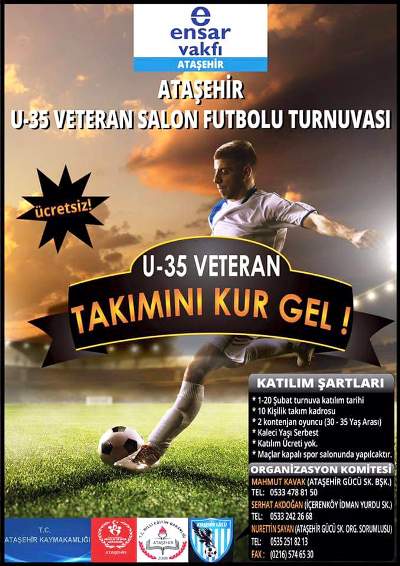 Ülkemiz insanının manevî dinamiklerini zenginleştirmek, ilmi, fikri ve ahlaki yönden gelişmesine katkıda bulunmak amacıyla 1979 yılında kurulmuş olan ve kurulduğu günden bu güne dek bu amaca ulaşabilmek için çeşitli alanlarda faaliyet göstermiş, özellikle de toplumun, gençlerin değerler eğitimine önem veren, katkıları olan, bu konuda eğitimcilere de kaynak olacak çok değerli yayınları ile katkıda bulunan, çeşitli il ve ilçelerde öğrencilere yurt ve barınma faaliyetleri de yürüten Ensar Vakfı Ataşehir Şubesi olarak U-35 salon futbolu turnuvasını başlatıyoruz.