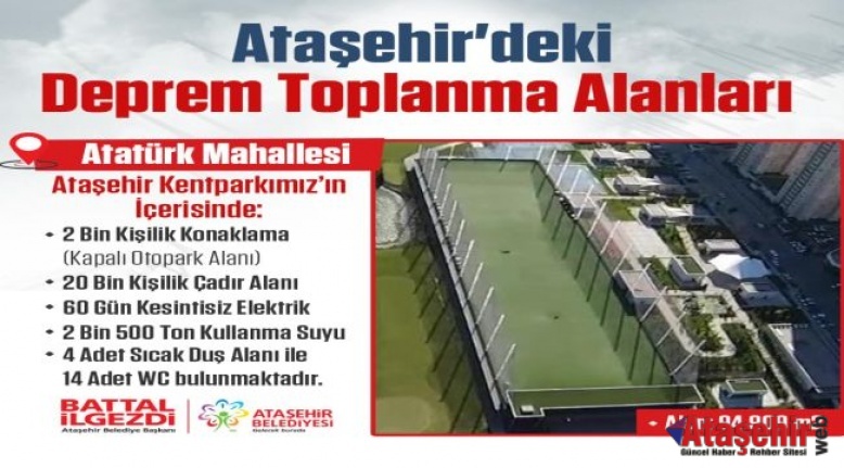Ataşehir’deki toplanma alanları hakkında bilgi veren Ataşehir Belediye Başkanı Battal İlgezdi şunları söyledi: “İstanbul’da gerçekleşebilecek olası bir afete karşı hazırlıklarımızı sürdürüyoruz. Bu kapsamda; deprem başta olmak üzere, olası bir afet durumu sonrasında yurttaşlarımızın ilk korku ve panik halini atlatabilmeleri, yakınları ile buluşabilmeleri ve başta Belediyemiz olmak üzere yetkililer tarafından sağlıklı bilgilendirmeye ve acil lojistiğe erişebilmeleri adına daha önce hazırladığımız toplanma alanlarımızı güncelledik. Ataşehir’de, 1 milyon 139 bin 982 metrekare alana sahip 152 adet afet toplanma alanlarımız bulunuyor. İlçemizde hem yeşil alanları genişletmek hem de afet durumunda halkımızın sığınacağı alanları çoğaltmak için çalışıyoruz. Yurttaşlarımızın kendilerine en yakın toplanma alanlarını bilmelerini önemle rica ediyorum. Umarım paylaştığımız bu bilgileri kullanmak zorunda kalmayız.”