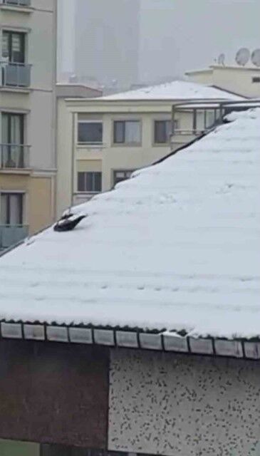 Ataşehir'de yoğun kar yağışı sonrası çatıda biriken kar üzerine konan karga, dakikalarca kar içerisinde yuvarlandı.