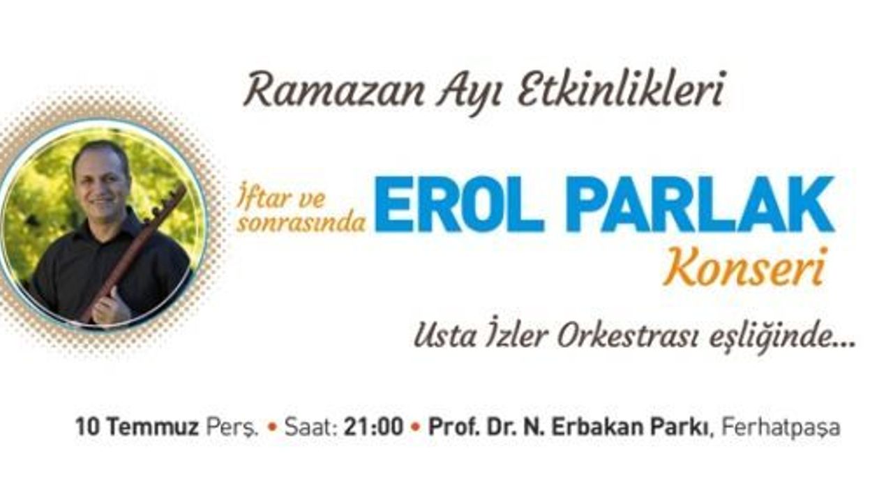 Usta İzler Orkestrası’nın eşlik edeceği Erol Parlak konseri Ferhatpaşa Mahallesi Prof. Dr. Necmettin Erbakan Parkı’nda iftar sonrası (saat 21:15) başlayacak.