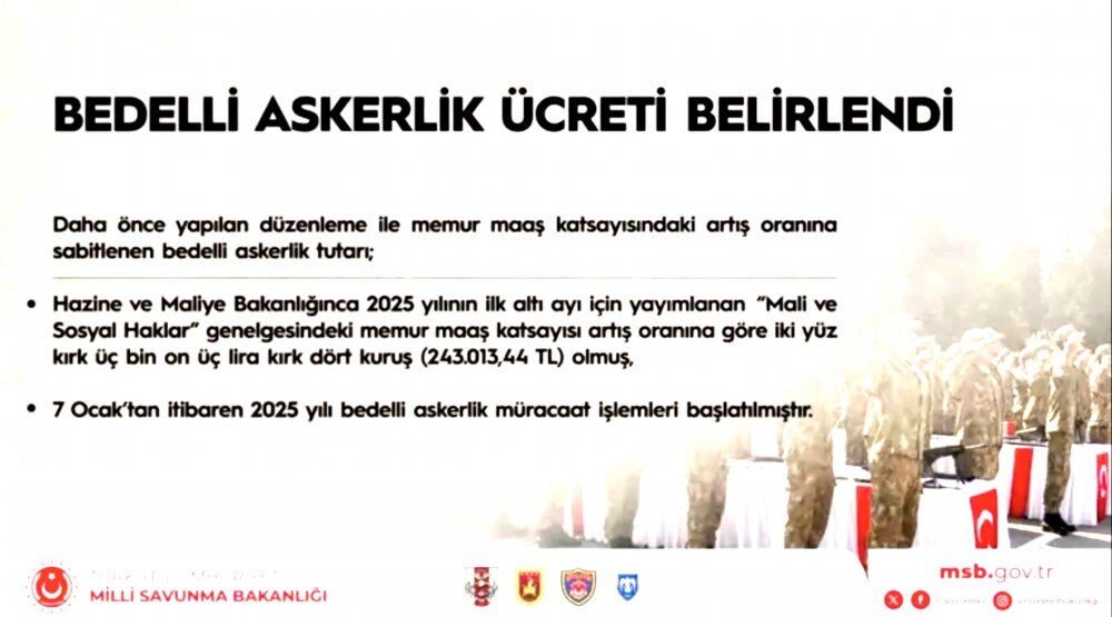 Bedelli askerlik tutarının daha önce yapılan düzenleme ile memur maaş katsayısındaki artış oranına sabitlendiğini anımsatıldığı metinde bedelli askerlik ücretinin 2025'in ilk altı ayı için 243 bin 13 lira 44 kuruş olduğu belirtildi.