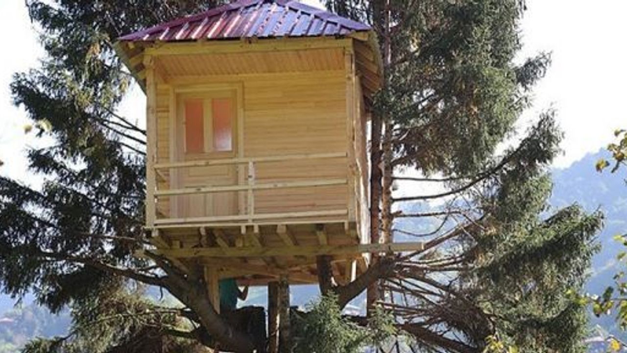 Rize'nin Hemşin ilçesine yaşayan Yusuf Yüce, manzara ve güneşten daha fazla yararlanmak uğruna yerden 20 metre yüksekte çam ağacının üzerine ev inşa etti.