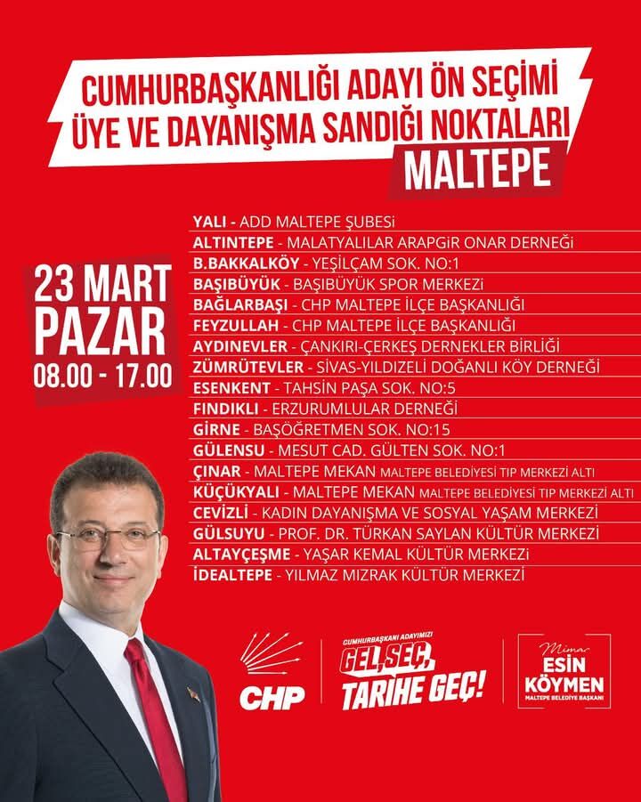 CHP, 23 Mart 2025'teki cumhurbaşkanlığı ön seçimi için İstanbul'da çok sayıda sandık kuracak. Hem parti üyeleri hem de üye olmayan vatandaşlar oy kullanabilecek. Sandık yerleri, İstanbul'un farklı mahallelerinde ve ilçe merkezlerinde olacak. İşte İstanbul'da CHP'nin ön seçim sandığının bulunduğu bazı ilçeler.