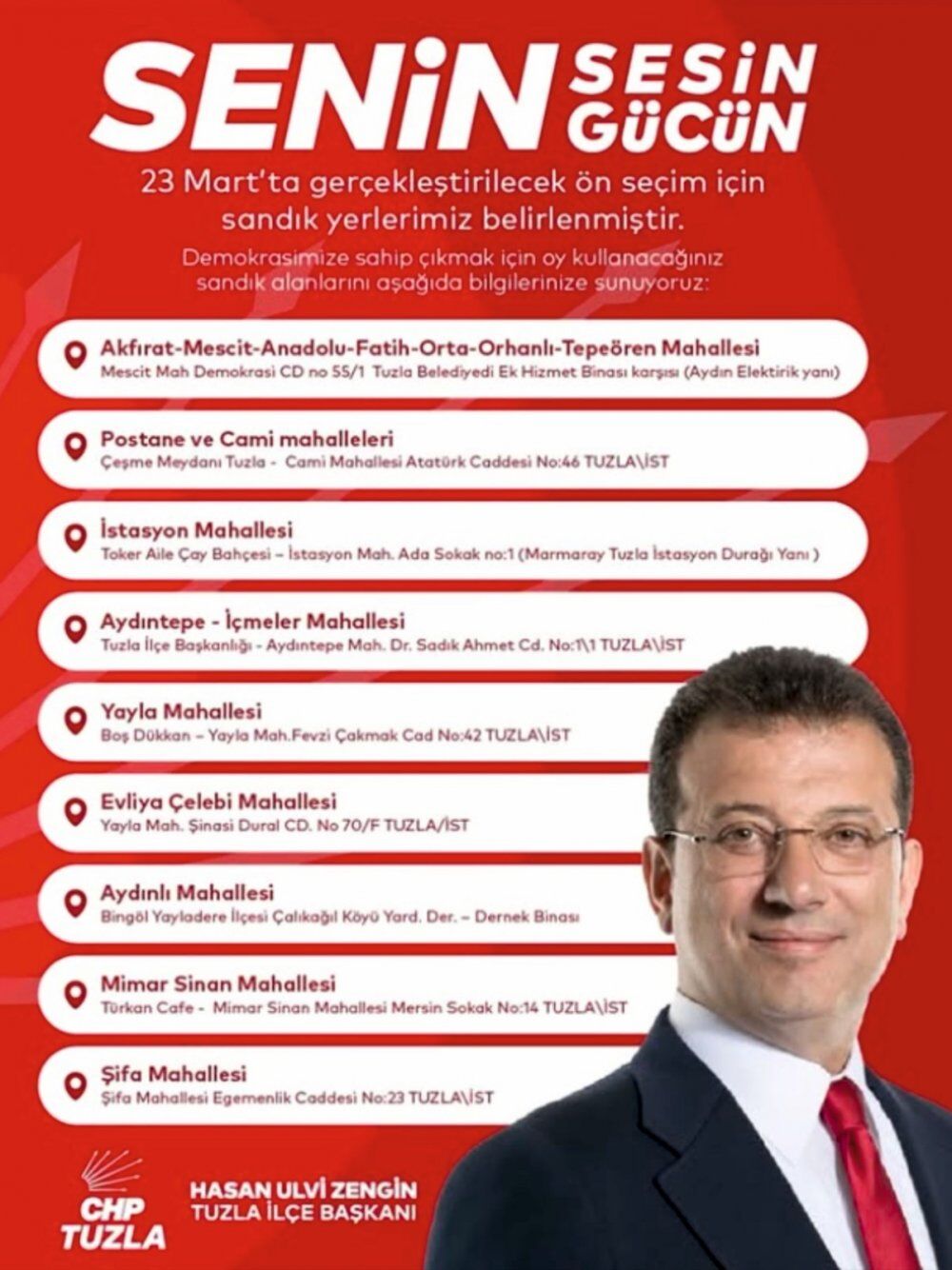 Sandık Alanı: ORHANLI MAHALLESİ-Mescit Mah Demokrasi CD No 55/1 Tuzla Belediyesi Ek Hizmet Binası karşısı (Aydın Elektrik Yanı) Tuzla