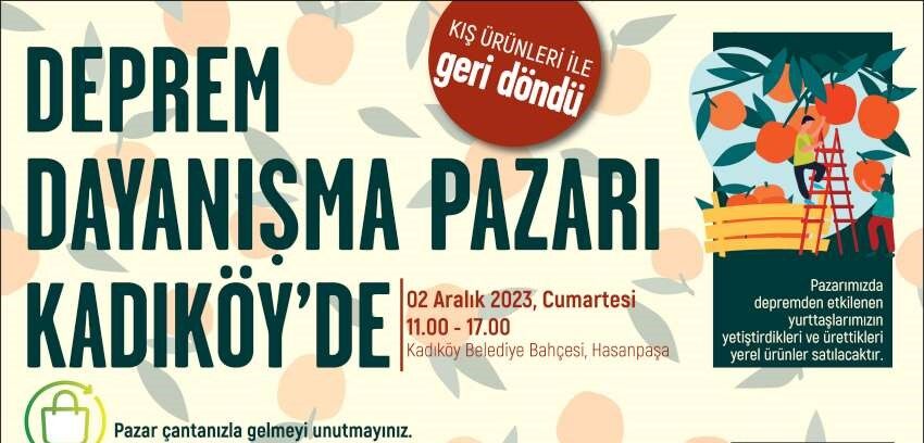 Kadıköy Belediyesi Deprem Dayanışma Pazarı, 2 Aralık Cumartesi günü Kadıköy Belediyesi’nin bahçesinde kurulacak ve saat 11.00 - 17.00 saatleri arasında açık olacak.