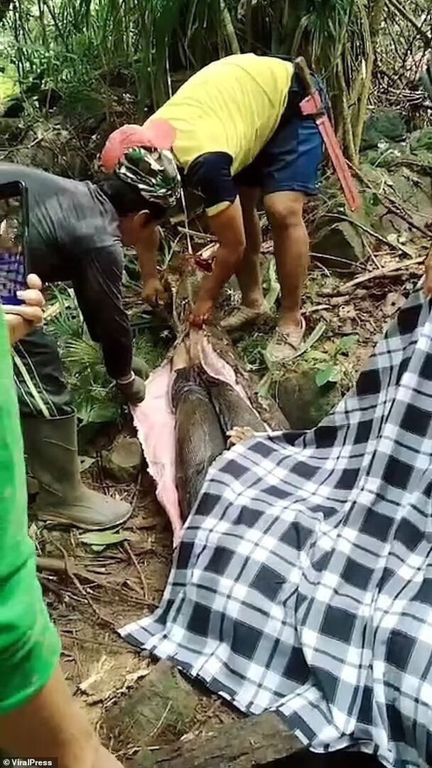 kadının kocasının ve köylüler aramalara devam edilirken, karnı şişmiş olan bir pitonla karşılaştı. Pitonun midesi yırtılarak açıldı ve bir kadın cesedi bulundu. Yılan karnı yarılarak kadının cansız cesedi çıkarılarak defnedildi.