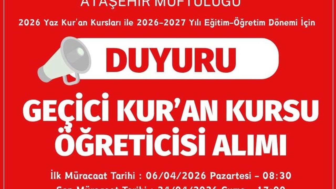 Ataşehir İlçe Müftülüğü, ilçedeki Kur’an kurslarında görevlendirilmek üzere sözlü sınavla "Geçici Kur’an Kursu Öğreticisi" alımı yapacağını duyurdu. İhtiyaç odaklı, hafızlık ve 4-6 yaş grubu kurslarını kapsayan alımlar için başvurular 6 Nisan’da başlıyor.
