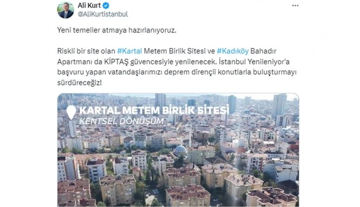 Riskli bir site olan #Kartal Metem Birlik Sitesi ve #Kadıköy Bahadır Apartmanı da KİPTAŞ güvencesiyle yenilenecek. İstanbul Yenileniyor'a başvuru yapan vatandaşlarımızı deprem dirençli konutlarla buluşturmayı sürdüreceğiz!" ifadelerine yer verdi.