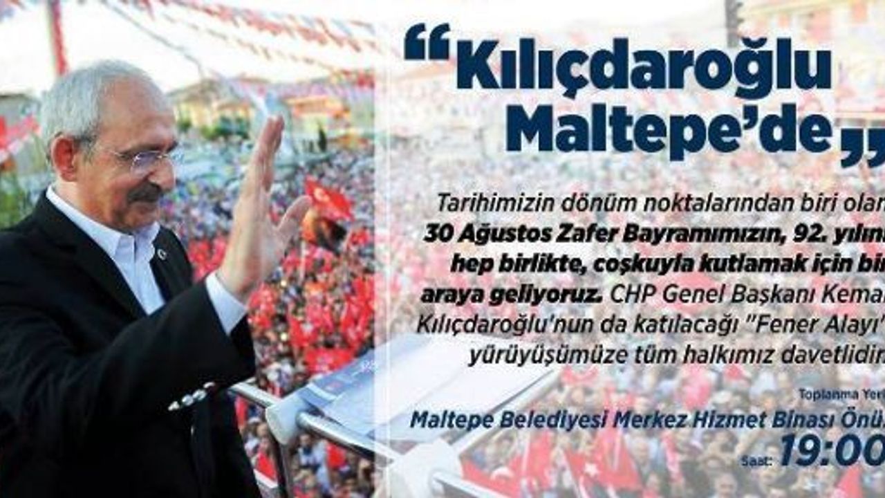 Tarihimizin dönüm noktalarından biri olan 30 Ağustos Zafer Bayramımızın, 92. yılını hep birlikte coşkuyla kutlamak için bir araya geliyoruz. CHP Genel Başkan Kemal Kılıçdaroğlu 'nun da katılacağı 'Fener Alayı' yürüyüşüme tüm halkımız davetlidir.