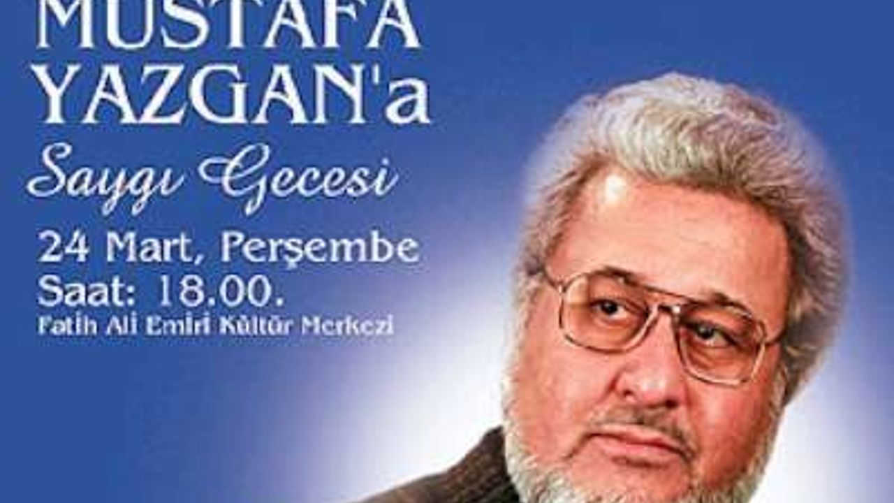 Mustafa Yazgan’a Saygı Gecesi<br>24 Mart 2011, Perşembe, Saat 18.00<br>Fatih Ali Emiri Efendi Kültür Merkezi<br><br><font size="4"><span style="font-weight: bold;">Konuşmacılar</span></font>: <br>İsmail Kahraman <br>PROF. Dr. Durali Yılmaz<br>Doç. Dr. Kahraman Emmioğlu<br>Yavuz Bülent Bakiler<br><br>Üstün İnanç<br><br>