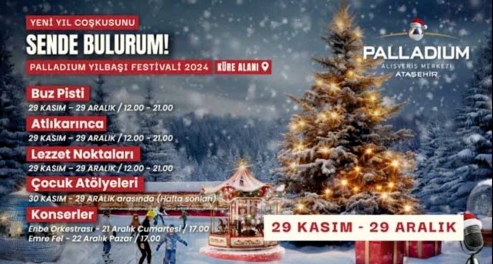İstanbul Anadolu Yakası ve Ataşehir bölgesinin moda merkezi Palladium Ataşehir AVM, heyecanla beklenen geleneksel yeni yıl etkinliklerini başlattı. 29 Kasım – 29 Aralık tarihleri arasında düzenlenecek olan Palladium Yılbaşı Festivali, lunaparkların vazgeçilmezi atlıkarınca, çok sevilen buz pisti, lezzet noktaları ve birbirinden özel çocuk atölyeleriyle her yıl olduğu gibi bu yıl da yılbaşı ruhunu doludizgin hissettirecek. ENBE Orkestrası ve Emre Fel konserleriyle taçlanacak olan bu rengarenk festival, hem yetişkin hem de minik misafirleri 2025 yılını müzik, eğlence, lezzet ve keyifle ışıltılar içinde karşılamaya davet ediyor.