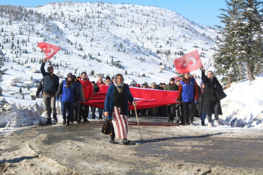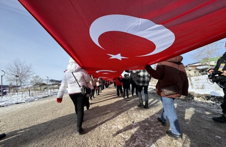 Ellerinde Türk bayrakları bulunan binlerce kişi, burada Kur'an-ı Kerim okuyup tekbir ve salavatlar getirerek şehitler için dua ettikten sonra soğuk havada Ay-Yıldızlı Tören Alanı'na doğru yürüyüşe geçti.