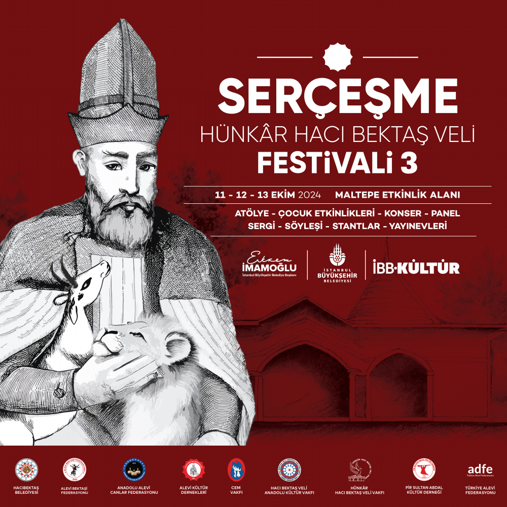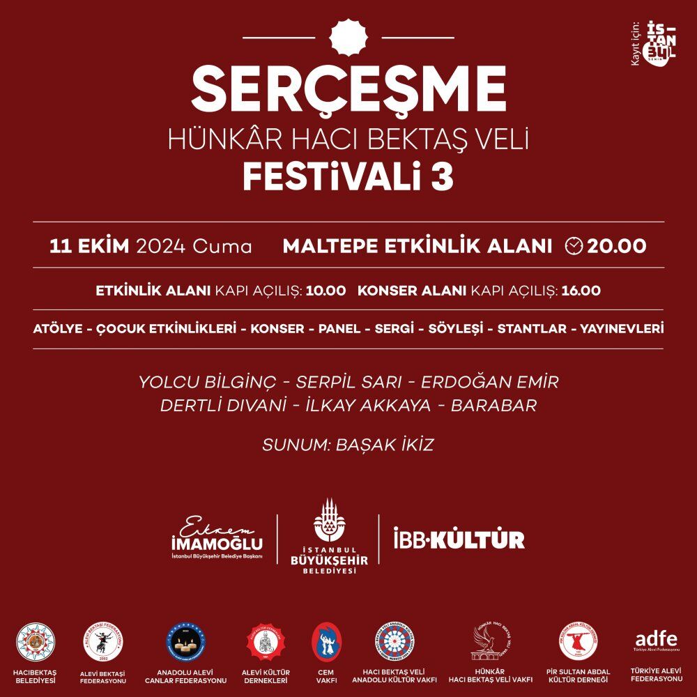 İBB tarafından bu yıl üçüncü kez düzenlenen Serçeşme Hünkâr Hacı Bektaş Veli Festivali, 11-13 Ekim 2024 tarihleri arasında Maltepe Etkinlik Alanı’nda İstanbullularla buluşacak. Alevi-Bektaşi kültürünün önemli unsurlarının da öne çıktığı festival, İstanbul’un çok kültürlü yapısını yansıtan programıyla her kesimden ve her yaştan katılımcıya hitap edecek. Üç gün boyunca, iki ayrı sahnede gerçekleşecek program, Alevi-Bektaşi müziğinin güçlü icracıları ve müzik dünyasının önemli isimlerinin yanı sıra genç isimlerin de katkılarıyla katılımcıları geniş bir müzik yelpazesi ile kucaklayacak. İBB Başkanı Ekrem İmamoğlu, festivalin ikinci gününde etkinlik alanını dolduran İstanbullulara hitap edecek.